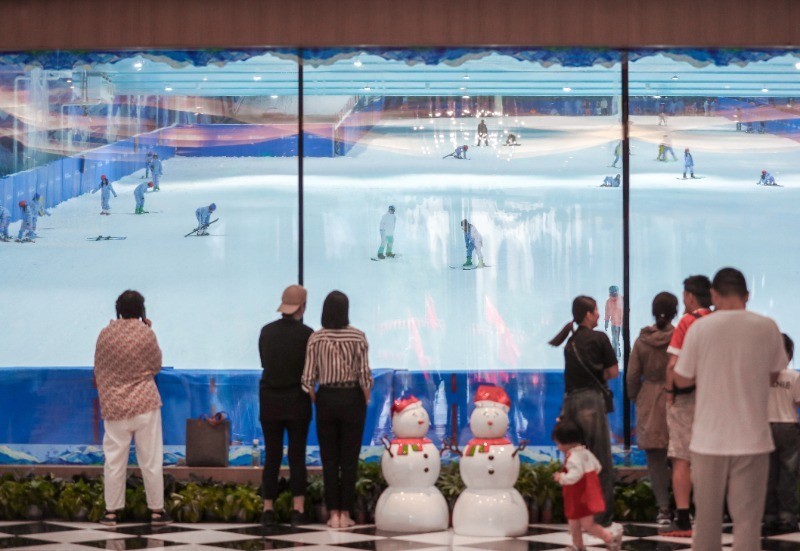7月16日,搭客们在湖州龙之梦冰雪世界场馆外不雅看室内滑雪 吴拯 摄