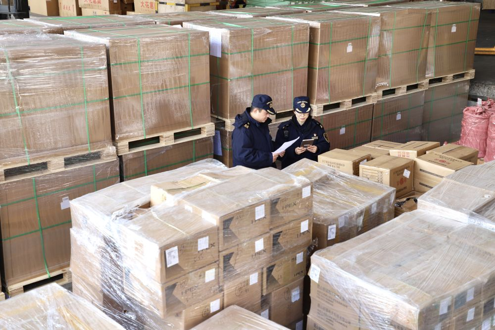 海关关员在昆明机场港口对入口商品开展监管搜检。(昆明海关供图)