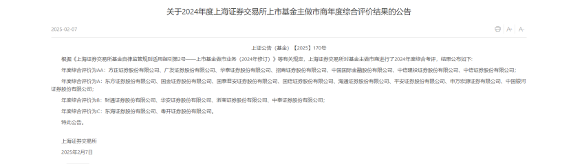 日前,上交所公布2024年度上交所上市基金主作念市商年度详尽评价后果。从最终评价后果来看,7家券商连获主作念市商AA欧洲杯体育,莫得券商赢得D级评价。