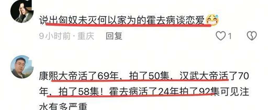 就拿这集数来说吧,有东谈主就辱弄,第1集才出身到成年,第2集就初始谈恋爱了,这程度几乎比火箭还快啊!一直谈到第91集,临了20分钟封狼居胥,再加20分钟死一火并回忆一世,这哪是拍电视剧啊,几乎便是在赶时候嘛,妥妥的“洗米剧”。有东谈主就说了,霍去病18岁到23岁成立5年,除掉吃饭寝息啥的,真实上战场的时候王人没这剧的集数长,这脚本若是能好,那才怪了呢。