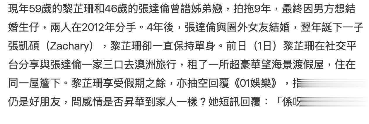 黎芷珊不护讳与前任全家一都旅游,又同住一个屋檐下,全球相处融洽,这件事被曝光后,有媒体专程隔空干系黎芷珊,问及此事。她很大方地承认这件事,还称全球仳离后仍是好一又友,还称厚谊照旧升华到像家东谈主不异。不详是因为彼此都莫得方式上的职守与费神,是以这技能仳离后酿成一又友,而且张达伦的内助也涓滴不留心,相处才会那么融洽。从张达伦的犬子与黎芷珊的互动进程来看,彼此早就很纯属了,这应该也不是黎芷珊与张达伦一家第一次来回,提及来亦然颇为贫瘠。