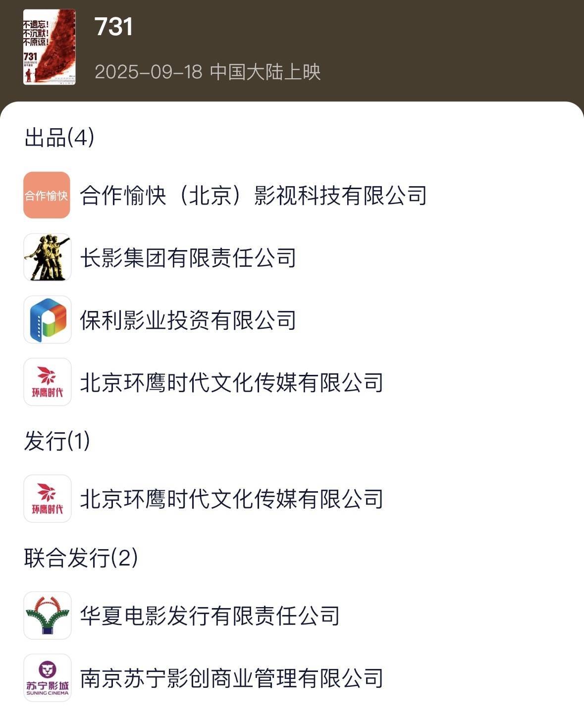 9月18日,电影《731》追究公映。