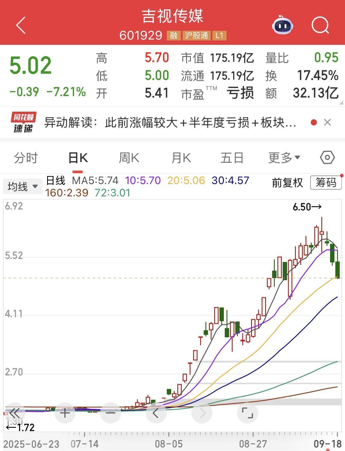 9月18日,吉视传媒下落7.21%,中国电影下落8.53%。