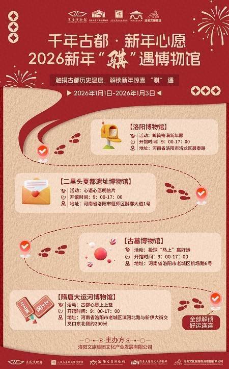 大河网讯(记者 赵檬)2026年元旦,洛阳的文化盛宴行将拉开帷幕。为理睬元旦与春节双节浮滥飞扬,深化文商旅和会、激励文博浮滥新活力,洛阳文旅将于2026年1月1日追究初始“2026新春‘骐’遇”博物馆元旦系列步履。算作新春系列步履的预热首章,本次步履联动二里头夏都作事博物馆、洛阳古墓博物馆、隋唐大运河文化博物馆、洛阳博物馆及周公庙博物馆五大概点场馆,打造集打卡互动、千里浸演艺、研学课程、特质展览与文创促销于一体的高品性文博新年盛宴开云(中国)Kaiyun·体育官方网站-登录入口,旨在鼓吹博物馆从“静态展陈”向全民分享的“文化游乐场”弯曲。